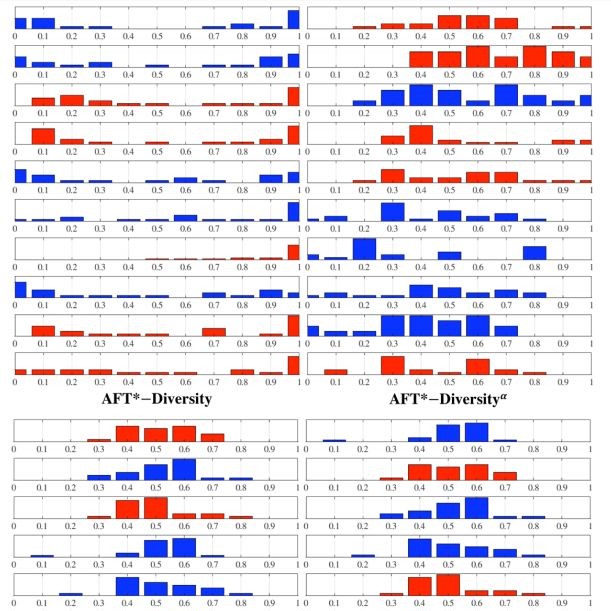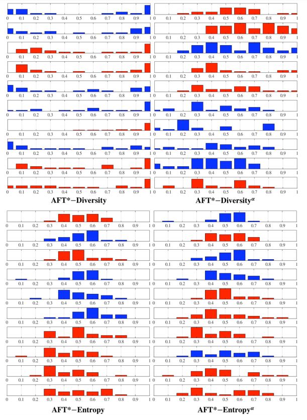 图 8:在结肠镜检查帧分类的第 3 步通过 4 种 AFT* 方法选择出的前 10 个候选数据。正例候选数据用红色表示,负例候选数据用蓝色表示。