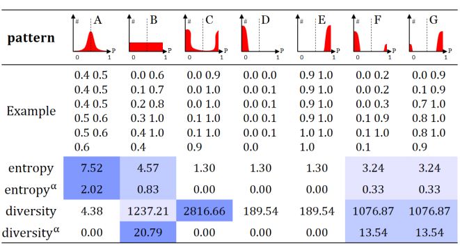 主动学习的关键是开发用于确定标注候选数据「价值度」的指标。我们的标准基于一个简单而强大的观察结果:所有根据同一候选数据增强得到的图块都具有同样的标签;预计当前 CNN 对它们的预测也相似。因此,它们的熵和多样性能提供有关候选数据的「能力」的有用指标,从而可帮助提升当前 CNN 的表现。直观上讲,熵代表了分类的确定性——更高的不确定性值表示更高程度的信息(比如,表 1 中的模式 A);而多样性是指在一个候选数据的多个图块上所得到的预测的一致性——多样性值更高说明预测不一致性程度更高(比如,表 1 中的模式 C)。