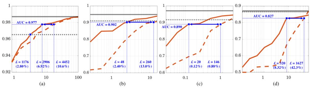 图 2(a) 比较了使用 Places 数据库的 AFT* 和 RFT。RFT 通过系统性的随机采样生成了 6 个不同的序列。最后的曲线是根据 6 次运行的平均结果绘制的。如图 2(a) 所示,在 AUC(曲线下面积)方面,仅使用了 2906 个候选数据查询的 AFT* 可以实现使用了 4452 个候选数据查询的 RFT 的表现;同时 AFT* 仅使用 1176 个候选数据查询就能实现使用全部 42000 个候选数据的完全训练(full training)的表现。因此,AFT* 相比于 RFT 能节省 34.7% 的标注成本,相比于完全训练能节省 97.2% 的标注成本。当使用了大约 100% 的训练数据时,其表现仍然在继续增长;因此,考虑到 GoogLeNet 架构有 22 层,所以这个数据集的大小还是不够。AFT* 是一种通用算法,不仅可用于生物医学数据集,而且也能用于其它数据集;AFT* 可用于有很多类别的问题。