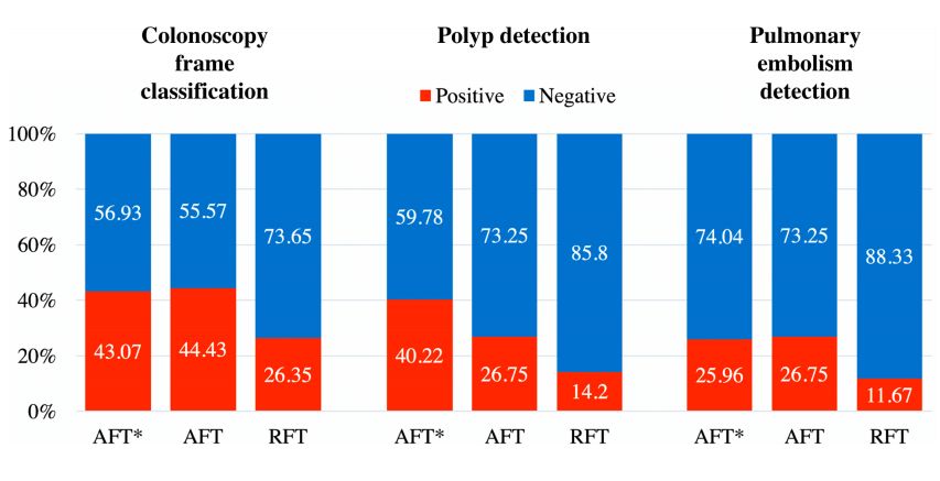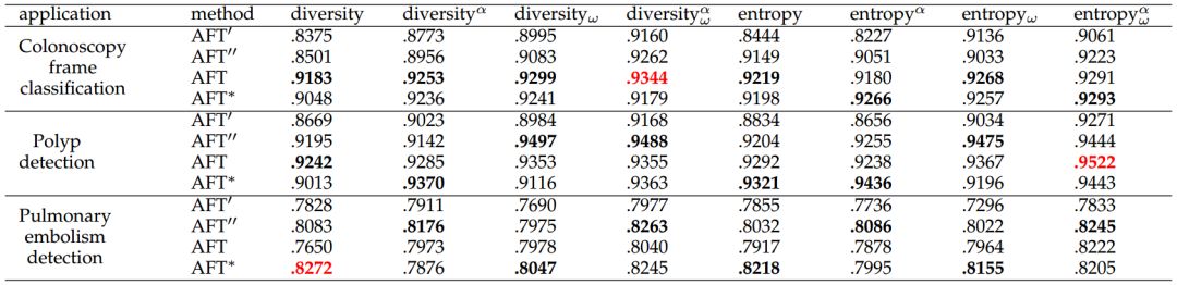 我们将我们的 AFT 和 AFT* 方法应用到了三种应用上,包括结肠镜检查帧分类、息肉检测和肺栓塞(PE)检测。