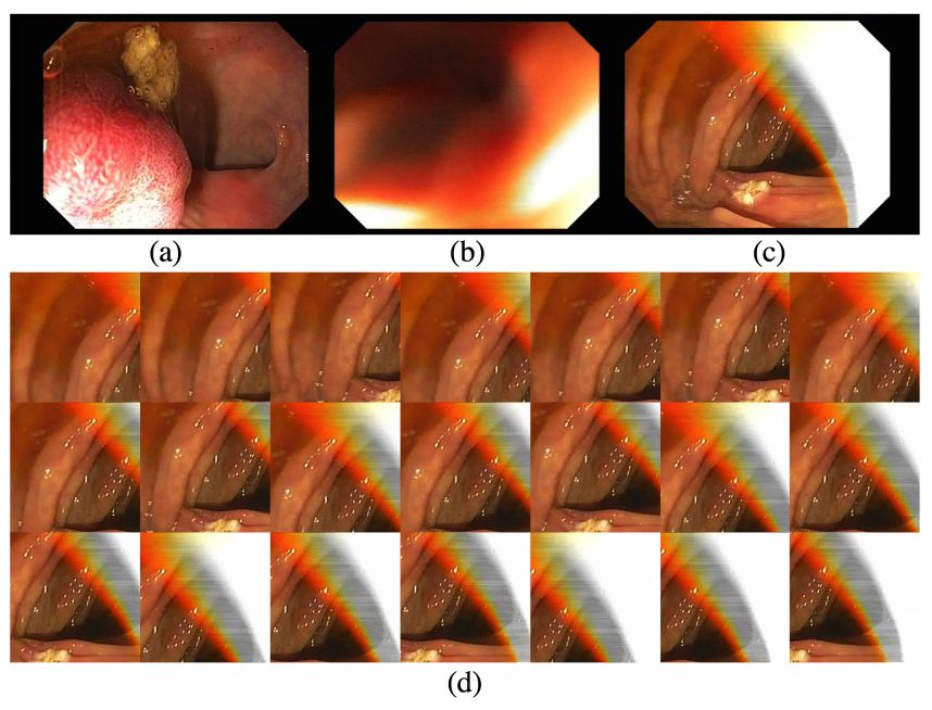 图 4:三种结肠镜检查示例:(a)有信息的、(b)无信息的、(c)不明确但标记为「有信息的」——因为专家根据整体质量标注帧:如果某帧(即该应用中的候选数据)中有超过 75% 是清晰的,那么就认为它是有信息的。因此,不明确的候选数据中同时包含清楚和模糊的部分,并且会根据自动数据增强生成图块层面的噪声标签。比如帧(c)整个都被标注为「有信息的」,但并非与该帧相关的所有图块(d)都是「有信息的」,尽管它们都继承了「有信息的」标签。这是我们的 AFT* 方法中使用多数选择的主要动机。