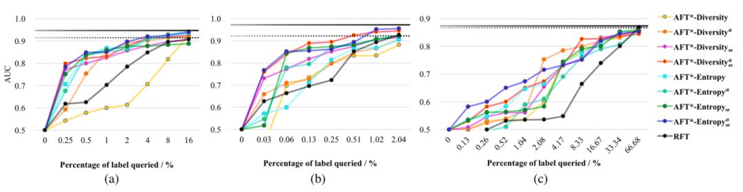 根据上面的讨论,可以推导出几种主动学习策略,如表 2 所示。我们对这些策略进行了全面的比较,结果表明:(1)AFT' 不稳定;(2)AFT'' 需要仔细调整参数;(3)AFT 与 AFT' 和 AFT'' 相比是最可靠的,但需要在每一步使用所有目前可用的有标注样本从一开始就对原始模型进行微调。为了克服这个短板,我们开发了一种优化版本 AFT*,可以使用新标注的候选数据以及被误分类的候选数据来持续优化当前模型。有些研究者已经证明微调能带来更好的表现,而且比从头开始训练更加稳健。此外,我们的实验表明 AFT* 的收敛速度比反复微调原来的预训练的 CNN 更快,从而可以节省训练时间;AFT* 还能通过去除简单样本,重点关注困难样本,防止灾难性遗忘来提升性能。