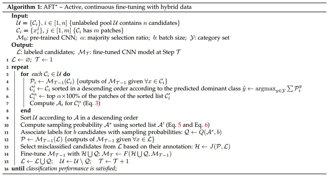 有些研究已经表明对生物医学图像分析 CNN 进行微调是有用的,但这些研究只执行了一次微调,也就是说,只使用所有可用的训练样本对预训练的 CNN 进行一次微调,而不涉及任何主动选择过程。就我们所知,我们提出的方法是首次以连续的方式将主动学习整合到 CNN 的微调中,可以使 CNN 对生物医学图像分析更加友好,实现极大降低标注成本的目标。算法 1 给出了我们的方法的概览;与传统的主动学习相比,我们的方法有 8 项优势: