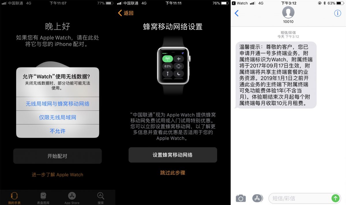 到这一步之后,你的苹果手表就可以正常地使用蜂窝网络功能了,套餐与资费标准与手机主号码保持一致。根据联通随后发过来的短信提示,在体验期(2018 年 3 月 7 日至 2019 年 3 月 6 日)内,开通费和月功能费全部免除;体验期结束后,次月起每个附属终端需收取 10 元/月的月功能费。