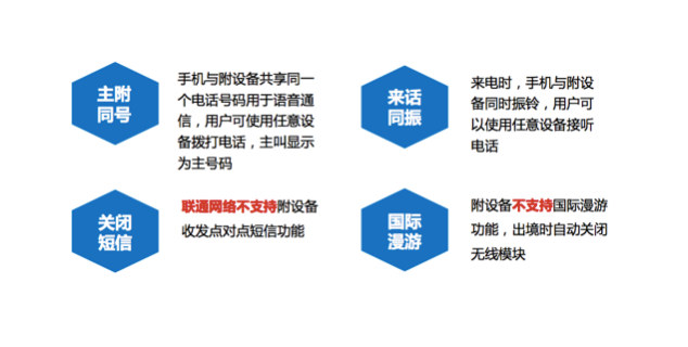 在使用联通 eSIM 卡一号多终端业务时,附属设备也不支持国际漫游功能,出境时会自动关闭无线模块;同时,联通网络也不支持附属设备收发点对点的短信。