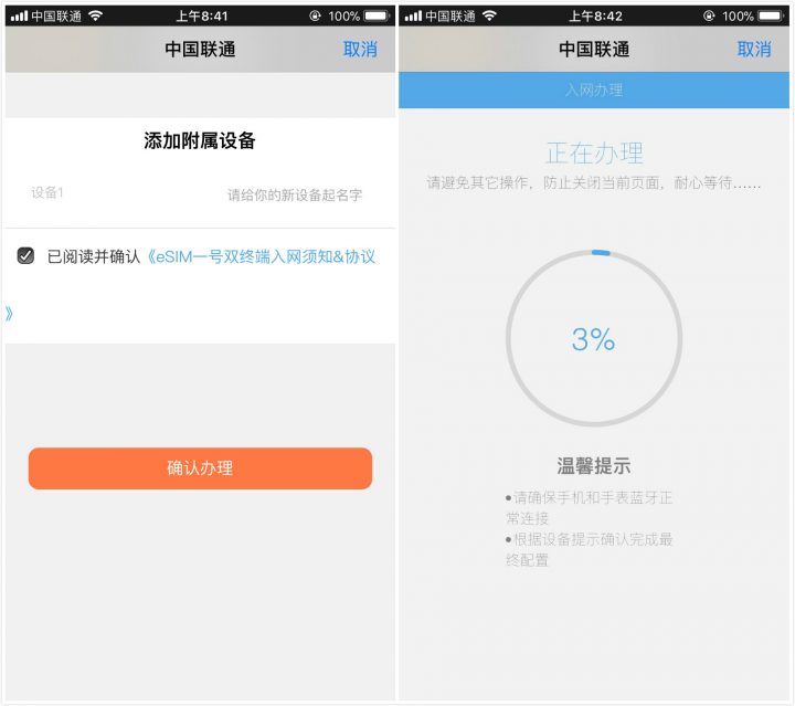 接下来,给自己的附属设备(也就是 Apple Watch)起个别名,点击“确认办理”;然后就会进入办理页面,等待那个蓝色进度圈慢慢转完。