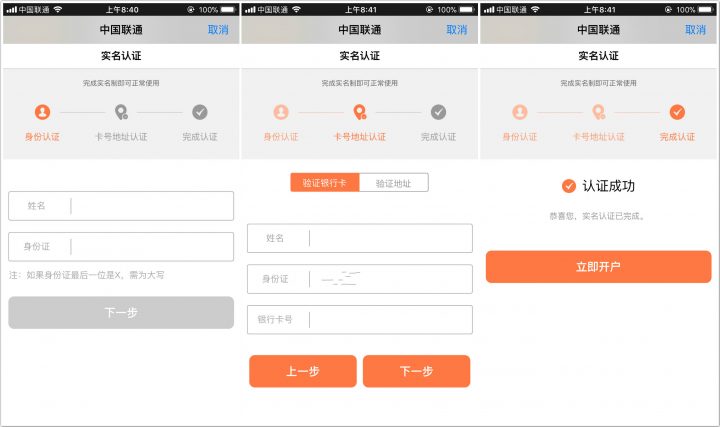接着要完成的是实名认证,再输入身份证号码之后,你可以选择使用银行卡号或者入网地址两种方式进行验证,认证成功后即可开户;