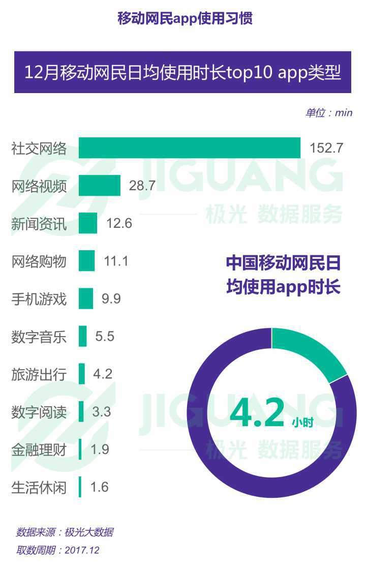 极光大数据最新发布的《2017年移动互联网行业盘点app榜单》中,12月中国移动网民日均使用APP时长为4.2个小时,其中社交网络APP占据了152.7分钟,超过一半,而数字音乐类APP时长只有5.5分钟。最近半年QQ音乐和网易云音乐每位用户的日均使用时长均不超过20分钟。