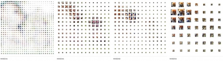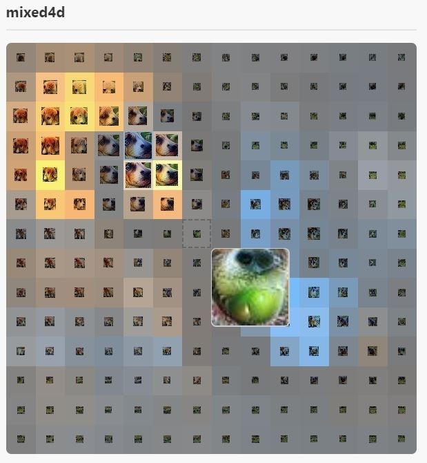 另外,通过跨层(例如「mixed3a」,「mixed4d」)的工作,我们还可以观察到网络对输入的理解是如何发展的:从检测早期图层中的边缘,到后期更复杂的形状以及物体的部分。