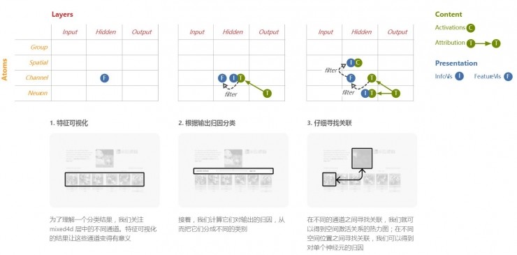 这篇文章的研究基于的模型是谷歌 GoogLeNet,选用它展现作者们的界面构建想法的原因是因为其中的神经元有强于一般网络的语义性。虽然这篇文章中作者们采用的是精心选择的任务和网络结构,其中的基础抽象手段和组合它们的方式还是可以用在其它领域的神经网络中。