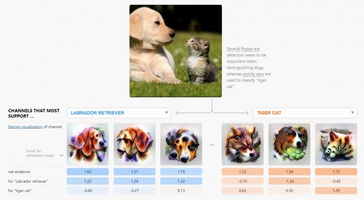 在这篇文章中,作者们把现有的各种可解释性方法看作基础的、可以相互组合的基础结构,在它们基础之上构建丰富的用户界面。他们发现这些互相独立的技巧也能够以统一的形式组合起来,在最后得到的界面中发挥补充性作用。更重要的是,这种统一的形式可以让我们系统地探索可解释性界面的整个空间,让我们得以评估它们是否达到了特定目标。下文中将展示各种样式的界面,从中展示网络检测发现了什么,并且解释网络对物体的理解是如何逐步生成的,同时还把其中涉及到的信息保持在适合人类理解的尺度下。比如,我们将会看到一个看到了拉布拉多犬的网络是如何检测它软塌塌的耳朵的,以及这种检测行为是如何影响网络的分类结果的。