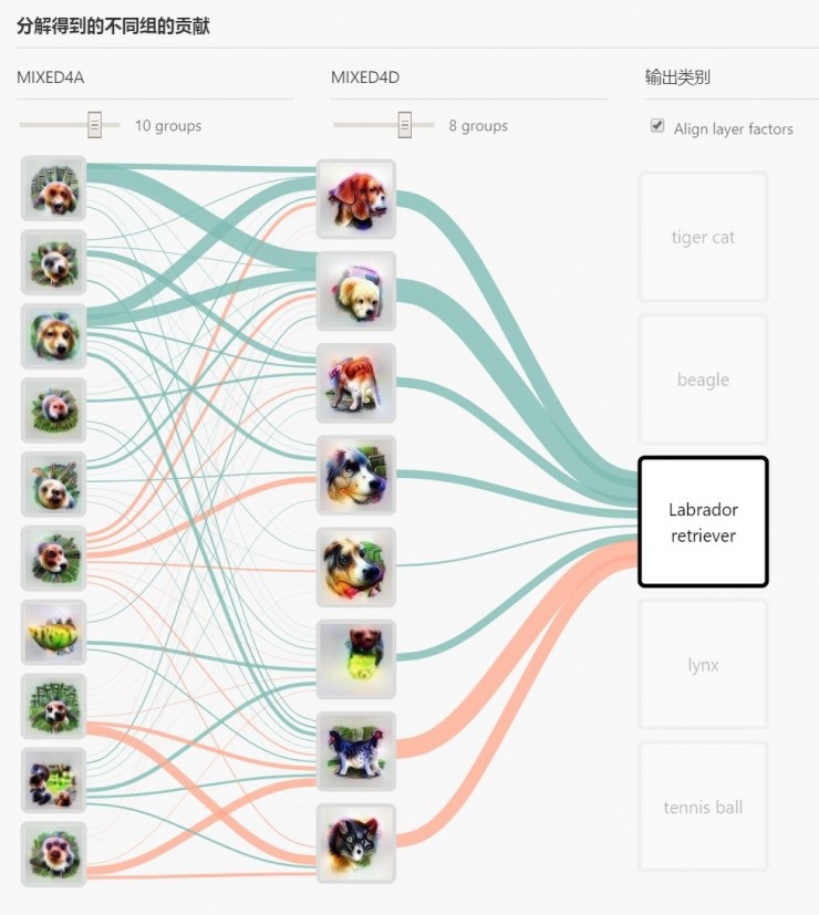 作为一种改进,我们将归因视为另一个用户界面的构建块(building block),并将其应用于神经网络的隐藏层。这样做了之后,我们同时也改变了我们的问题,我们不再问特定像素的颜色是否对「拉布拉多猎犬」的分类很重要,而是问在这个像素位置检测到的高级别想法(例如「松软的耳朵」)是否重要。这种方法与类激活映射(CAM)方法类似,但由于它们将结果解释回输入图像,因此它们错过了以网络隐藏层的丰富行为进行交互的机会。