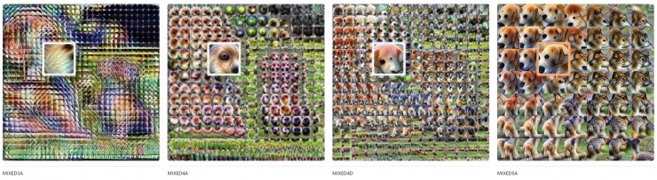 去年在在线期刊 Distill 上,谷歌大脑的研究人员再次使用这项技术将单个神经元在网络中是如何工作的进行了可视化,这项工作让我们可以看到在网络中间的各个神经元如何一步步检测到图像中的各个事物,并且让我们看到随着网络层次的加深图像如何越来越复杂。雷锋网曾经在下面这篇文章中详细介绍过