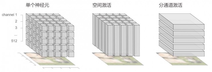 图中用于计算机视觉任务的神经网络的不同的隐含层如何组成了激活值的“立方体”。对立方体的不同分割方法可以把激活值具体到单个神经元、单个空间位置或者单个通道
