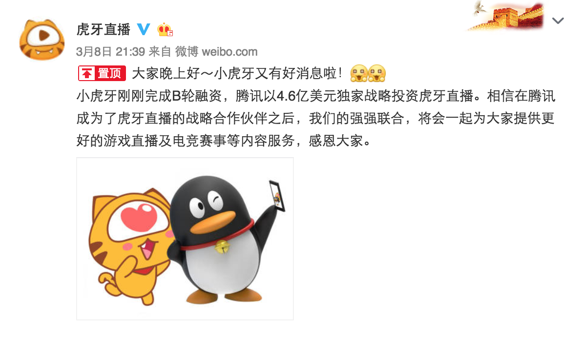 原标题:【钛晨报】虎牙IPO前夕完成B轮融资:获腾讯独家战略投资4.6亿美元 【钛媒体综合】继3月6