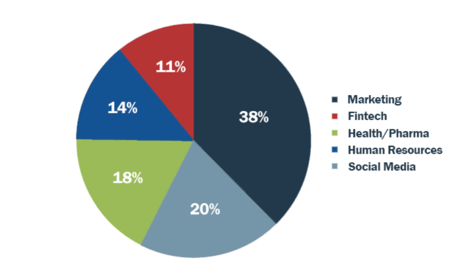该报告指出加拿大目前AI企业主要集中在以下五个领域:市场营销、金融科技、医疗/制药、人力资源以及社交媒体。其中市场营销(38%)和社交媒体(20%)占据了加拿大AI企业的半壁江山。然而,和美国的同类竞品相比,加拿大显然不具有太大的优势,相关行业的“蛋糕”已经被瓜分的差不多了,要想有所突破,就必须找准自己特色,集中发力,才有可能培育出加拿大新的科技巨头。