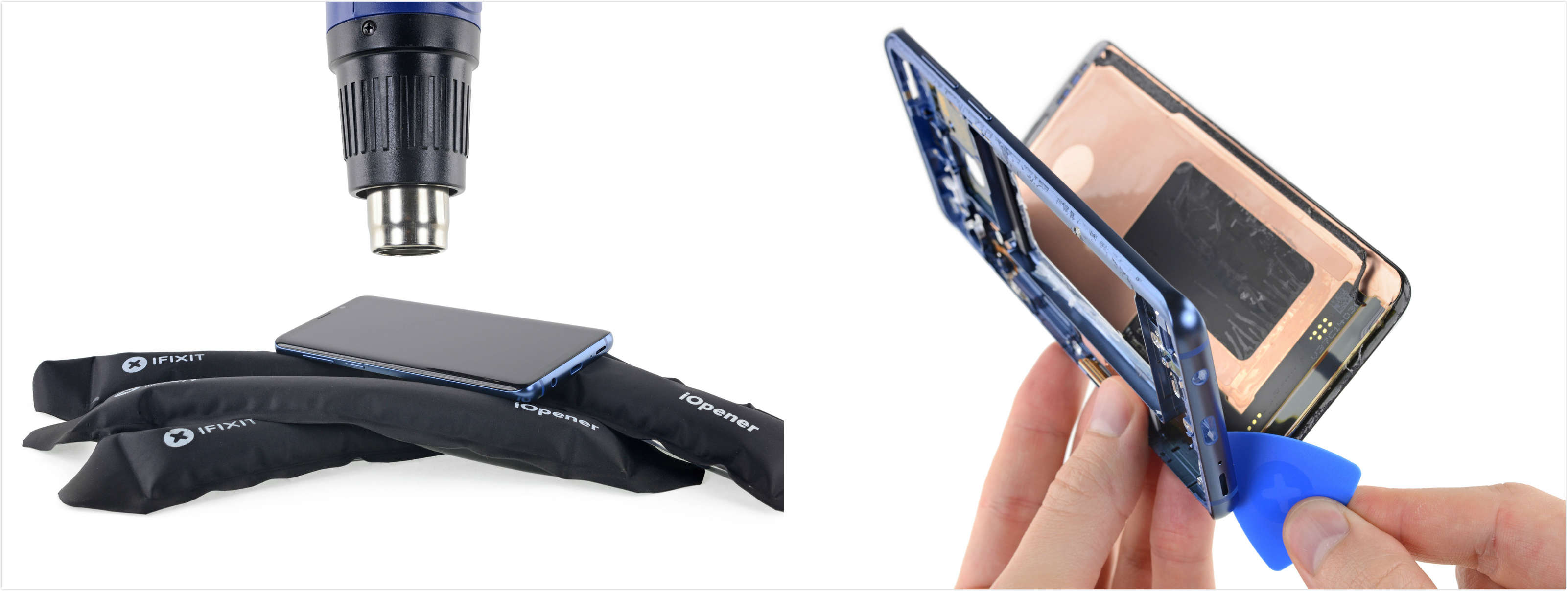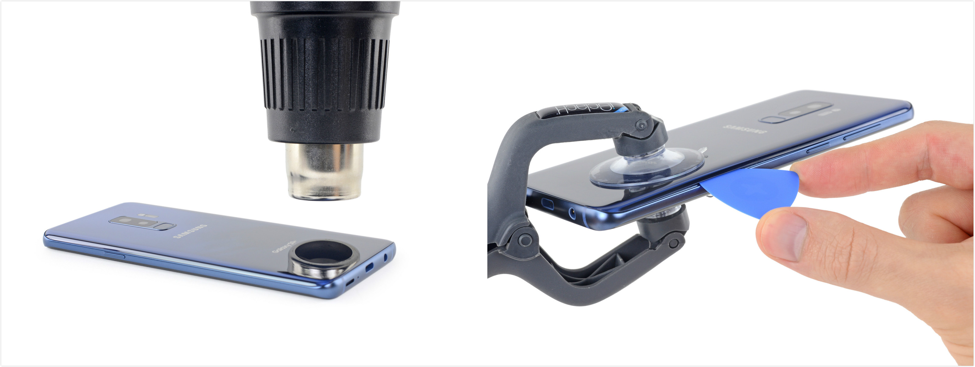 为了一睹这颗「可变式光圈」摄像头的真容,iFixit 的工作人员还是费了一番功夫。他们先用热风机加热了 S9 的背面,以便让 S9+ 金属中框和玻璃背板之间的胶水溶解,然后,再用吸盘和拨片撬开 S9+。