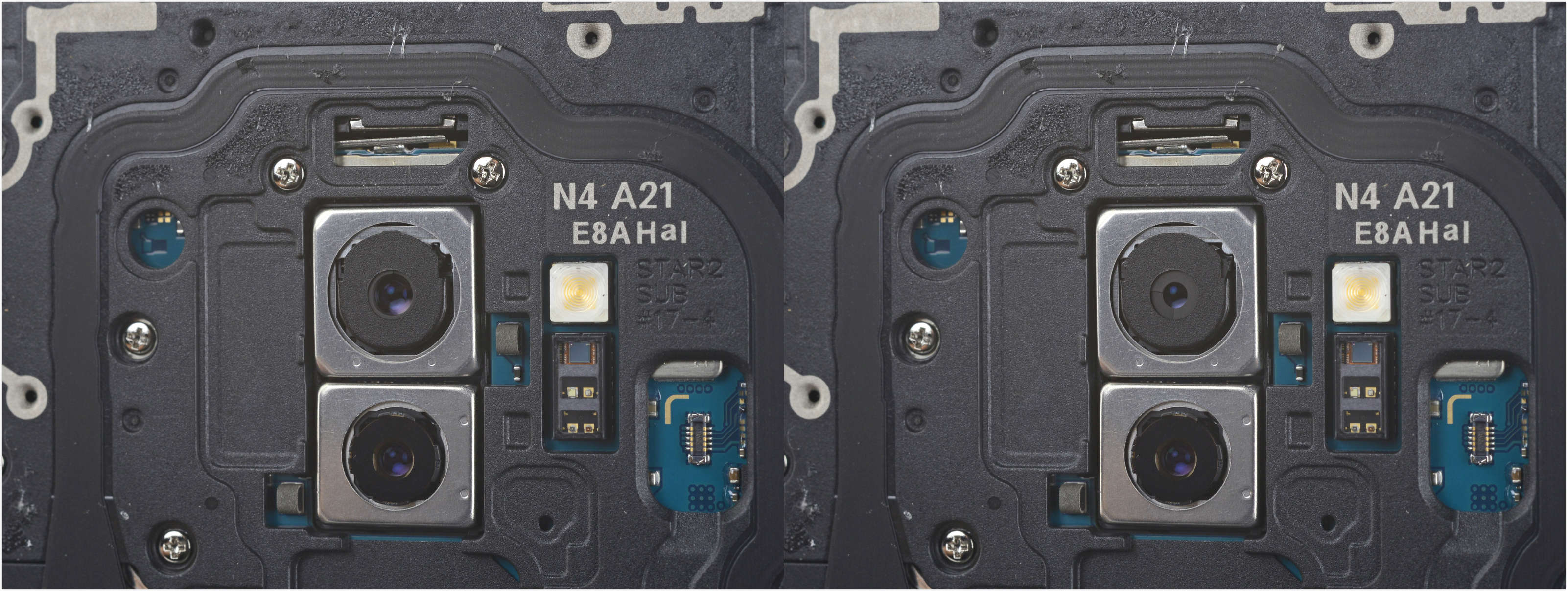 可以看到,Galaxy S9+ 的内部结构与去年 Galaxy S8+ 较为相似,而两者最显著的区别就是 S9+ 上那个由一大一小的摄像头组成的双摄模组。