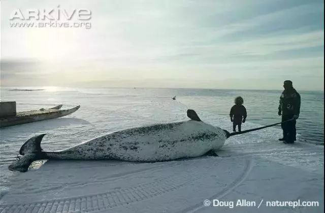 凛冽寒风中,因纽特猎人竭尽全力,将一头一角鲸(Monodon monoceros)拖上冰面。这是他们把生命抵押给冰海换取的战利品。鲸油是冬夜里的光、鲸肉是抵御严寒的力量,鲸皮是维C的重要来源;对于在苦寒之地挣扎求生的因纽特人,这头一角鲸可能意味着生存的全部希望。