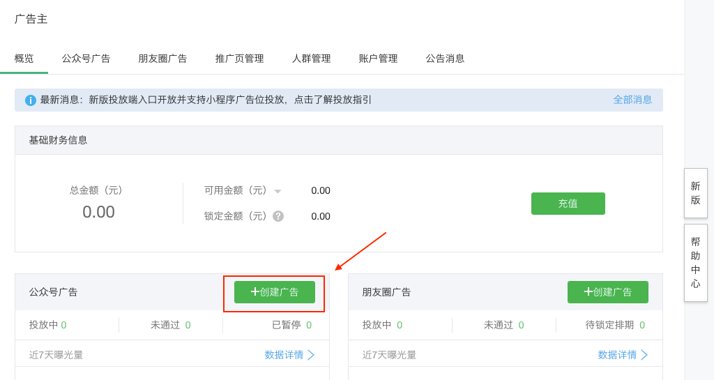 1. 登陆微信公众平台,在左侧侧边栏选择「推广」——「广告主」,并在右边的页面中选择「新版」。