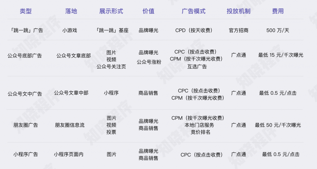 知晓程序帮你整理了一份现有广告投放方式的对比: