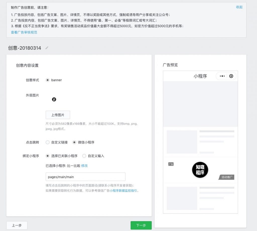 4. 上传广告 banner 素材,并且选择点击跳转的落地页。目前可以跳转的又自定义链接和微信小程序。其中,跳转的小程序必须要与进行投放的公众号绑定。