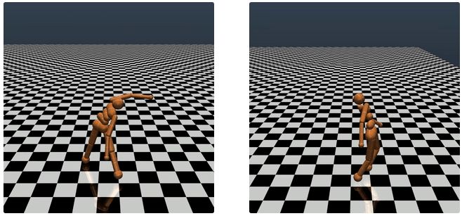 图 1 :经过遗传算法 (左) 和进化策略 (右) 训练的模拟机器人的行走情况。