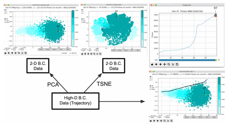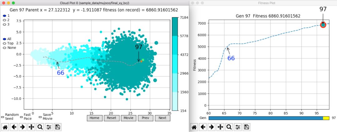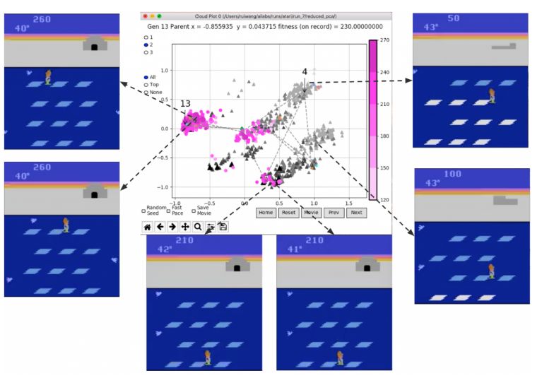 从图中我们可以观察到,随着进化的进行,伪子代云向左移动并在那里聚集。这个工具让我们看到每个智能体相应的玩游戏视频,由此可以推断出每个集群对应的语义意义上的不同结束状态。