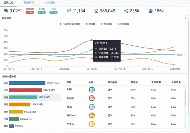 在此基础上,洞察品牌声量驱动的关键角色以及内容,助力投放渠道、KOL的优化和品牌内容运营。依靠DataStory覆盖全网90%以上海量的数据积累,获悉品牌网络声誉现况与变化趋势,洞察品牌声量驱动的关键角色的人群画像,以及内容品牌声量还可以与同行业其他品牌的声量进行对比,做到化繁为简,知己知彼。