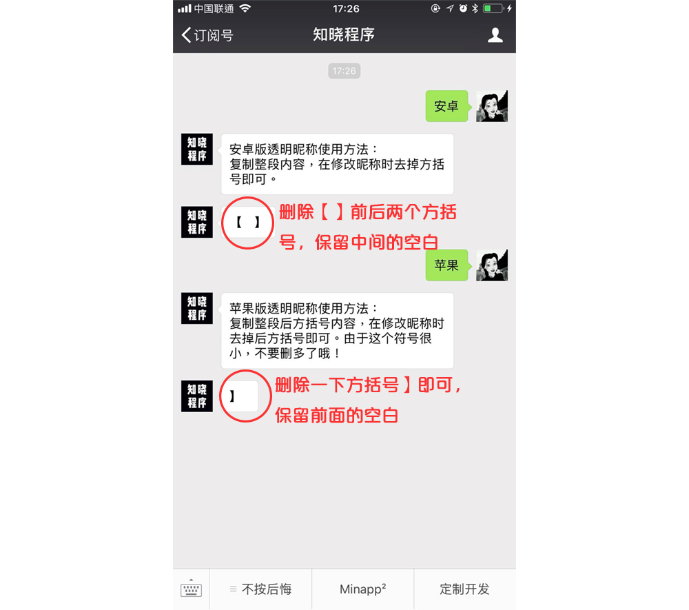 在「知晓程序」后台回复「安卓」,获得 Android 版透明昵称;回复「苹果」,获得苹果版透明昵称。如果回复消息后显示内容不全,不要着急,再回复一次。