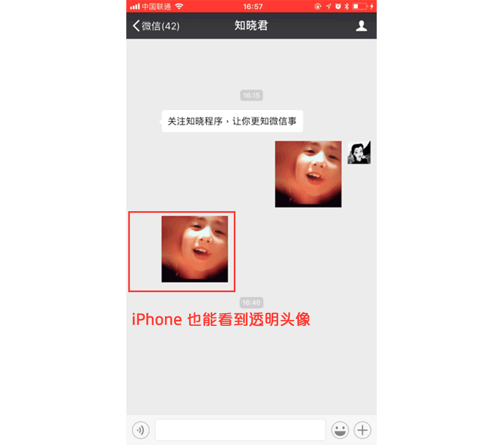 3. 虽然是用 Android 手机设置的头像,在 iPhone 上同样显示透明状态。但当 iPhone 用户放大你的透明头像后在对方手机上会变成白色: