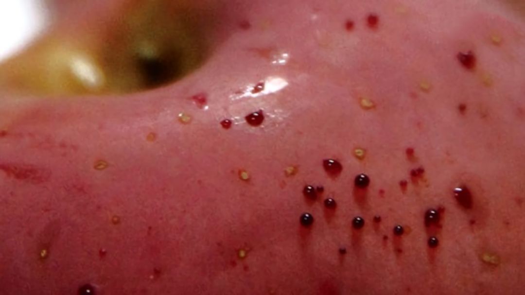 最近,浙江杭州一位姑娘意外地发现,用热水烫洗过的苹果,居然会渗出点点滴滴的红色“血珠”,看起来有点惊悚。究竟是怎么回事?