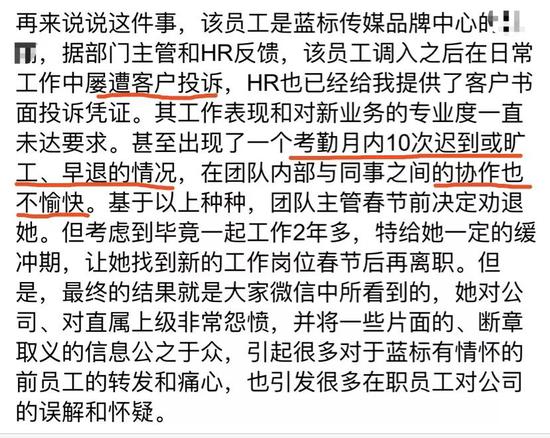 公司持续在这一点上给我们施压,认为我们给公司造成了损害。但我们认为稿子反映的实质问题是蓝标逼迫员工辞职的行为,本文之所以引起社会反响,也正恰恰因为蓝标的这种行为遭到了曝光。