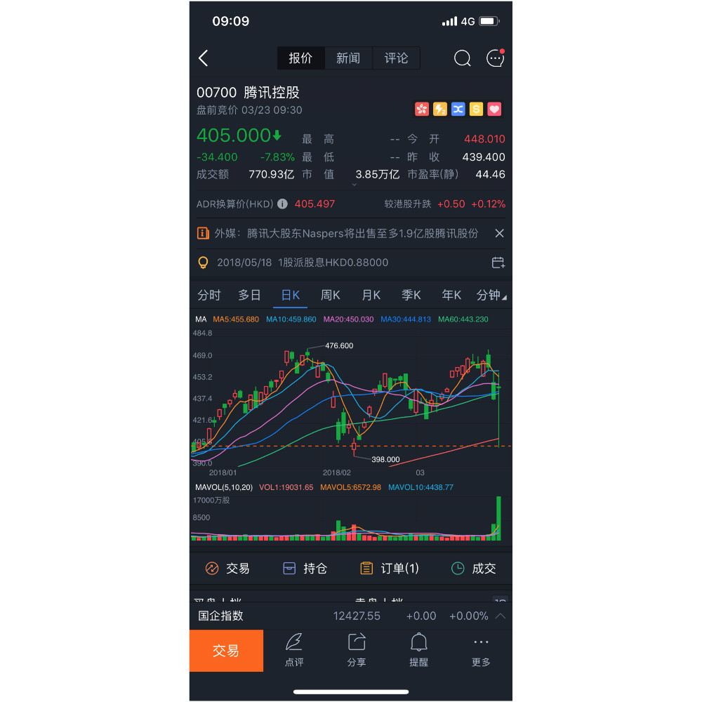 今日,腾讯控股跌幅近 8%,开盘价 405 元。