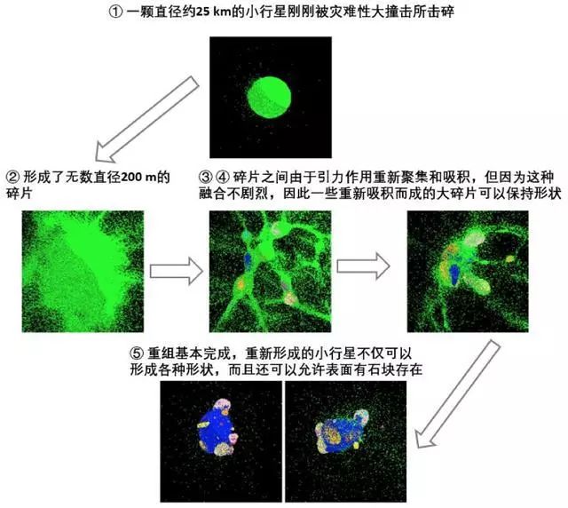 一个很自然的推理就是:同族的小行星们都是同一颗母天体被撞出来的碎片!法国尼斯天文台的Michel团队的模拟曾表明,撞击后的碎片可以快速完成吸积和重组,形成各种形状的小天体。