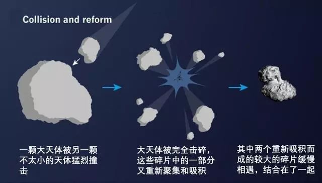 灾难性撞击说就是基于这种撞击事件的进一步猜想:一颗被毁灭性大撞击完全击碎的大天体的千百万块碎片中,一部分碎片又重新聚集和吸积,两块较大的碎片结合成了如今的彗星67P。
