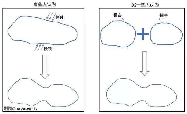 侵蚀说和撞击说示意图。局部性的侵蚀作用可能是由由于彗星在近日点附近的排气作用引起的局部质量损失等原因造成的。制图:haibaraemily