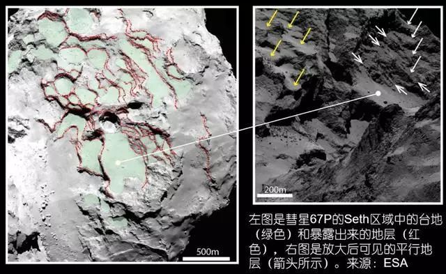 左图是彗星67P上Seth区域中的台地(绿色)和暴露出来的地层(红色)。右图是放大后的平行地层。图片来源:ESA