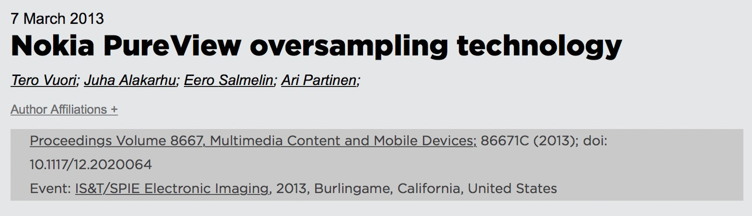 四散东西的诺基亚团队PureView 技术的实现源于诺基亚影像部门多年的努力,在 2013 年,诺基亚曾发表过一篇关于 PureView 超采样技术和产品的论文,文章的作者有四位,分别为 Tero Vuori、Juha Alakarhu、Eero Salmelin 和 Ari Partinen,他们大多都参与了诺基亚和微软 Lumia 时代的 PureView 影像开发工作,也都是当年的技术专家。