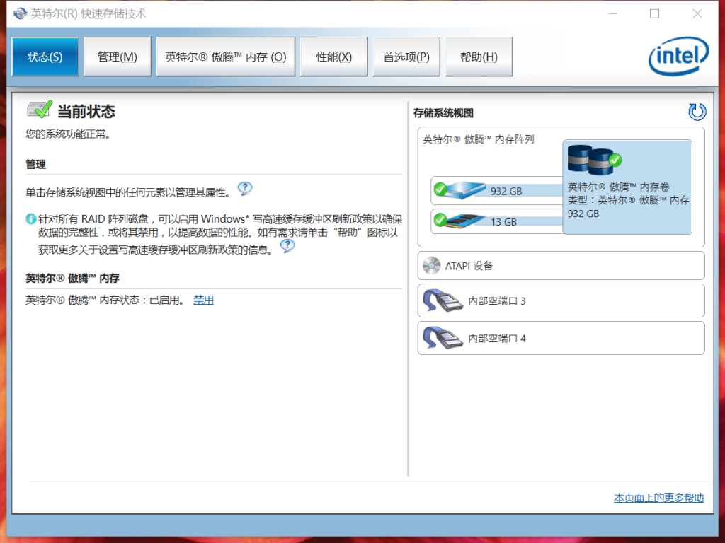 在安装完驱动之后,无论是在 Windows 10 的系统属性当中还是在 Intel 的快速存储技术管理界面当中,都可以看到系统已经把傲腾内存和机械硬盘识别为单一设备。