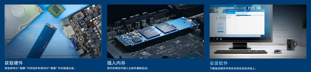 在 Intel 的官网上,清晰明确地说明了要想享用傲腾内存的三个步骤:获取硬件,插入内存,安装软件。