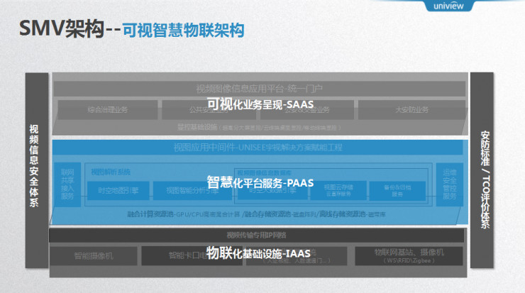 宇视在SMV(安防视觉)架构上,底层是物联网基础设施,包括智能摄像机、智能卡口、电警等等,在上层是智慧化平台服务,有时空地图引擎、视图智能分析引擎、时空大数据引擎、视图云存储,这中间有一个UNISEE是输出接口。再往上属于应用平台,包括综合治理业务、公共安全业务、公安和交警业务、大安防业务。左右两翼是视频信息安全体系和安防标准,这个整体架构可以保证AI在安防业务的落地。