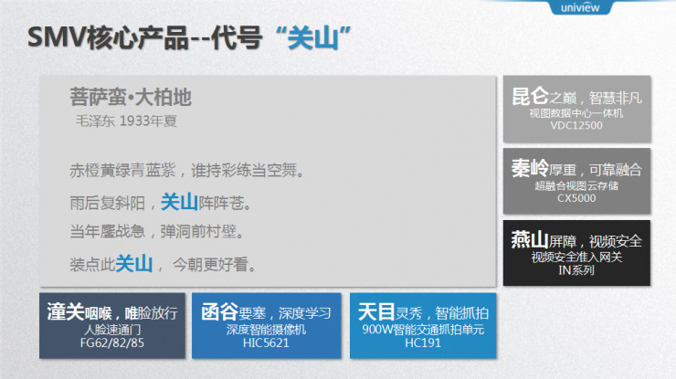 核心产品的代号叫“关山”,主要的产品是昆仑——视图数据中心一体机、秦岭——超融合视图云存储、燕山——视频安全准入网关、潼关——人脸速通门、函谷——深度智能摄像机、天目——智能抓拍单元。