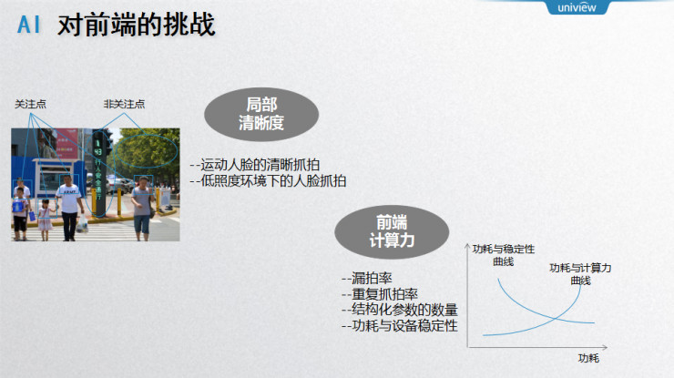 以AI对前端的挑战为例,摄像机和AI如何在人脸抓拍当中能够做得更快更好,前期我们都做了大量的探索。我们要解决算力和前端功耗工程性和产品性中的一些矛盾,以及在复杂环境下能够正常工作,这些都是对前端的重要挑战。