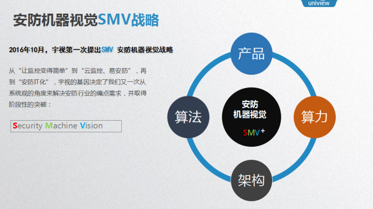 2016年10月,宇视第一次提出SMV安防机器视觉战略。从“让监控变得简单”到“云监控、易安防”,再到安防IT化,整个宇视的基因一直是从系统端的角度来解决安防行业的痛点需求。在产品解决方案的整体思路上,则是单产品要做到最优,自由产品的组合是要比别的组合产品效率更高。
