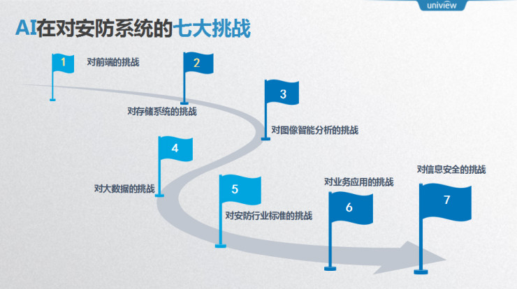 虽然安防行业里,算法已经开始大量应用,但是用户需求和环境适应性还在持续演进。在这样的背景下,AI对安防行业提出了7大挑战:对前端、存储系统、图像智能分析、大数据、安防行业标准、业务应用、信息安全的挑战。