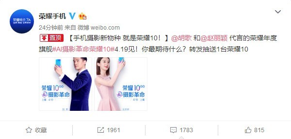 中关村在线消息:今天,荣耀手机官方微博正式公布了将于4月19日召开新品发布会,发布荣耀今年上半年的首款旗舰手机荣耀10。另外在微博中还宣布胡歌和赵丽颖将再出成为荣耀10手机的代言人。