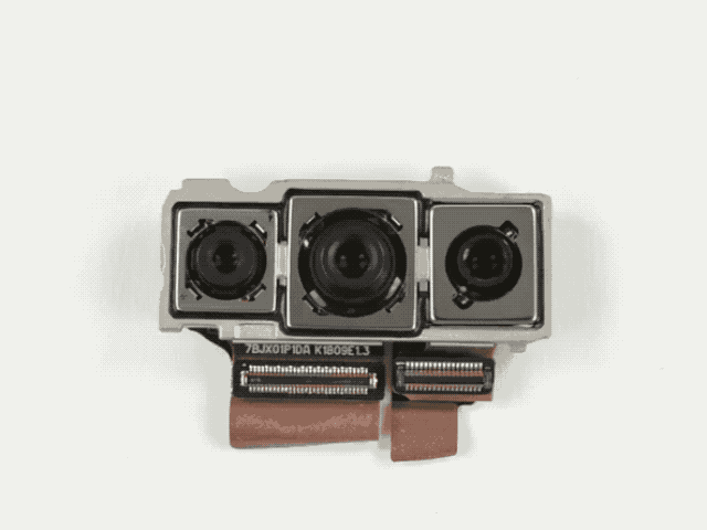 从侧面来看,最右的长焦摄像头凸起的高度较大 其中,那颗 4000 万像素的主摄使用了 1/1.7 英寸的传感器,它比 iPhone X 上 1/2.9 英寸传感器以及三星 Galaxy S9+ 的 1/2.55 英寸的传感器还要更大一些,其 ISO 最高能达到 102400。 更重要的是,iFixit 通过拆解后发现,无论是那颗 4000 万像素的彩色摄像头,还是那颗看上去「最扁」的黑白摄像头,它们都拥有 OIS 光学防抖功能。