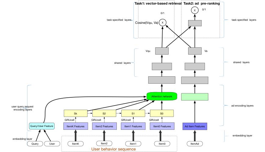 针对这个问题,我们创新的提出了一种联合优化向量化检索模型和粗排模型的方法。该方法通过 Multi-task Learning 的方式端到端的学出两个模型。在向量化检索模型中,特征上除了上文提到的 Graph Learning 出来的向量,还加入了图像向量等,行为序列上采用 RNN 建模;粗排模型和向量检索模型公共特征和大部分网络结构,只在最后一层有一些区别,这样在在线 Inference 阶段可以节省大量计算。