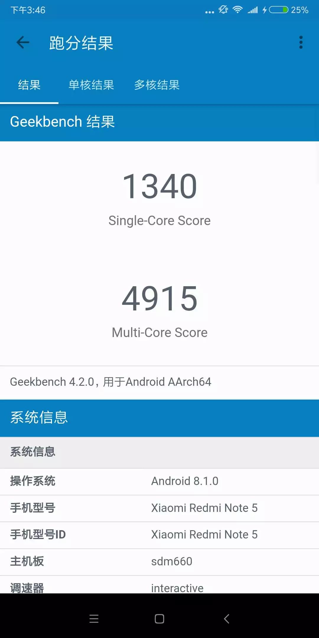 在 GeekBench 的跑分中,红米 Note 5 的得分为单核 1340、多核 4915,和骁龙 660 相比差距不是很明显。